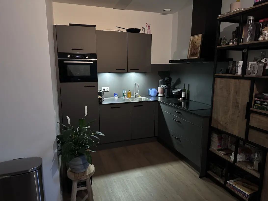 - Woonkamer met open keuken welke is voorzien van onder andere een koelkast (zonder vriesvak), combimagnetron, inductiekookplaat met 4 kookzones, recirculatie afzuigkap en vaatwasser;