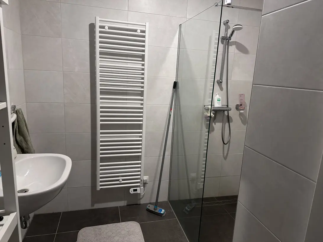 - (Deels) betegelde badkamer voorzien van inloopdouche met vaste glazen wand, wastafel en radiator;