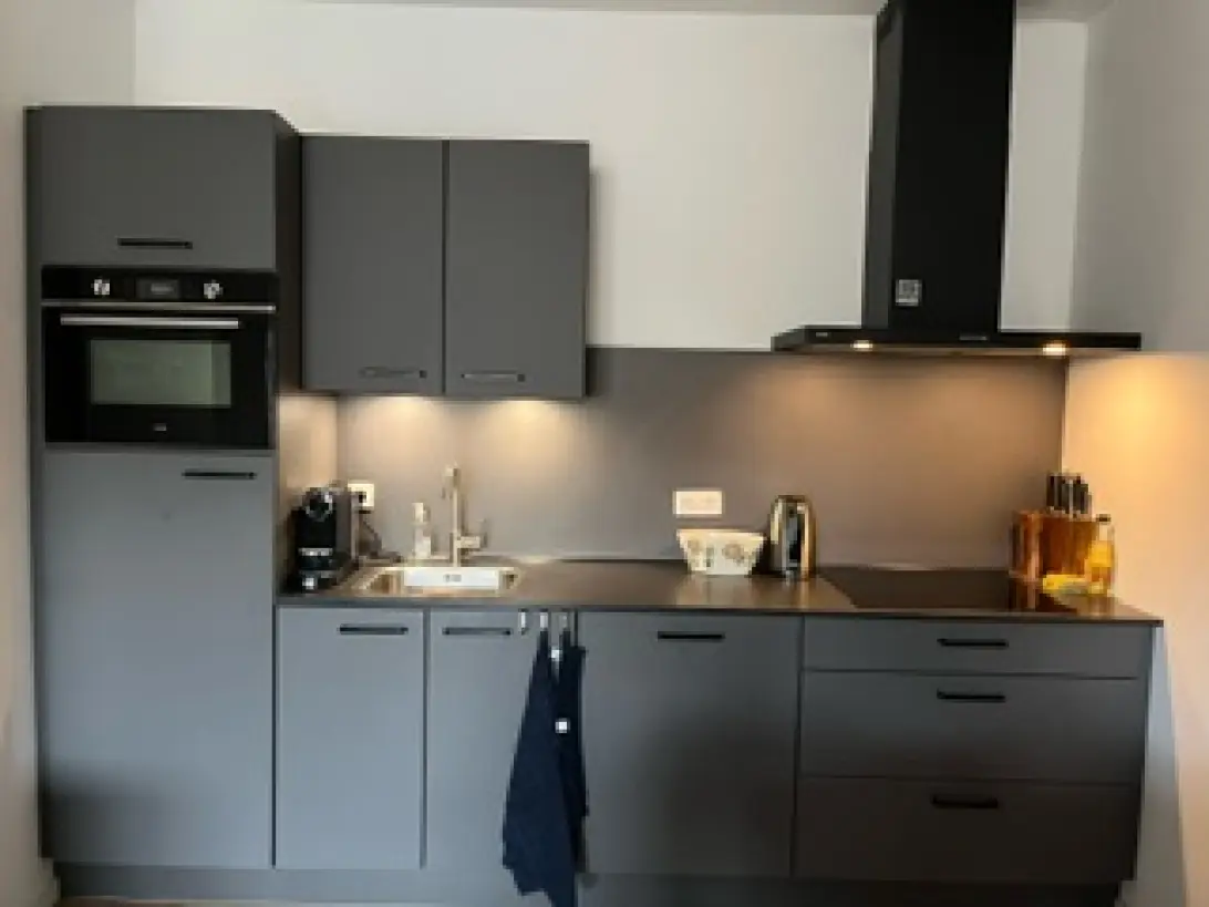 - Woonkamer met open keuken welke is voorzien van onder andere een koelkast (zonder vriesvak), combimagnetron, inductiekookplaat met 4 kookzones, recirculatie afzuigkap en vaatwasser;