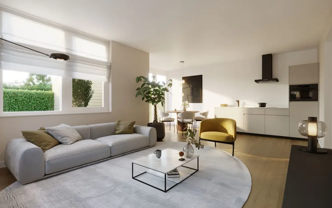 - Woonkamer met open keuken voorzien van composiet werkblad en diverse inbouwapparatuur (Siemens of gelijkwaardig) waaronder koelkast met vriesvak, inductiekookplaat, combi-oven/magnetron, vaatwasser en recirculatieafzuigkap;