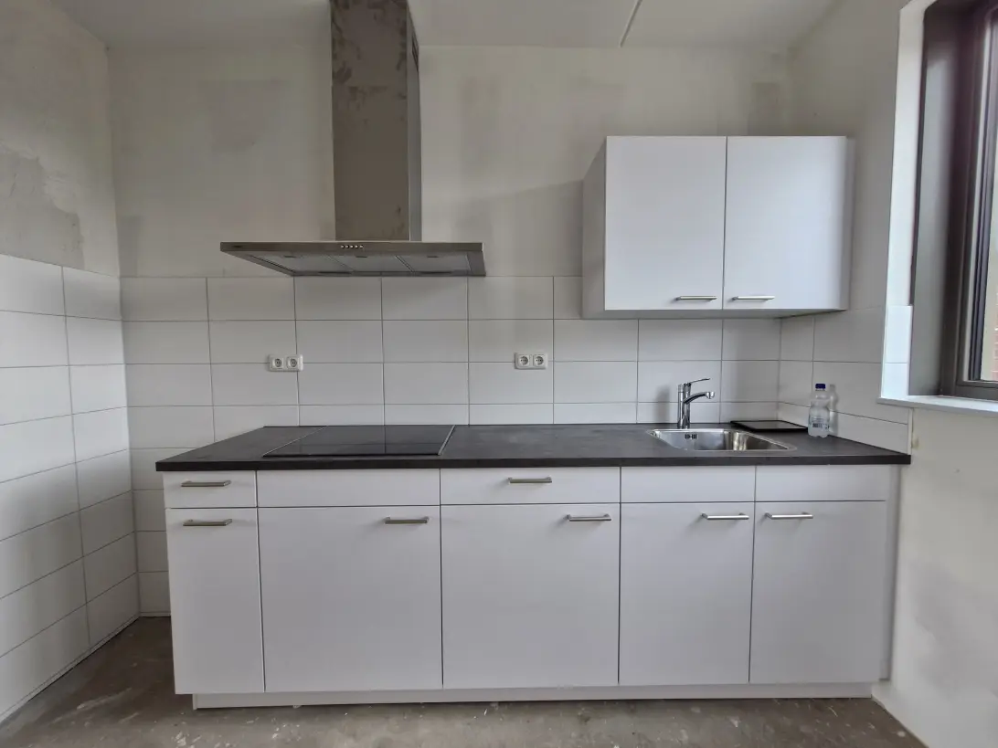 - Keuken aan voorzijde voorzien van onderkasten (wit), multiplex werkblad, RVS spoelbak, elektrische kookplaat en schouwwasemkap;