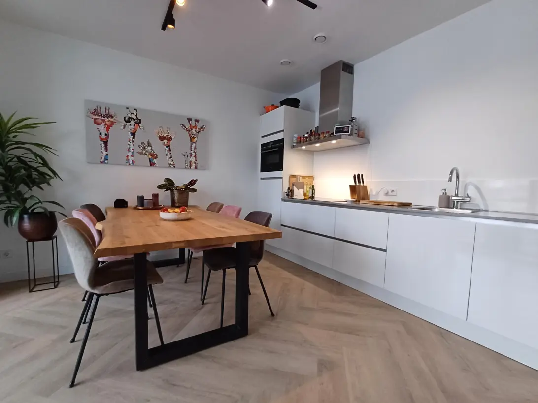 - Woonkamer met open keuken voorzien van diverse inbouwapparatuur waaronder vaatwasser, koelkast, kookplaat met afzuigkap en combimagnetron/oven;