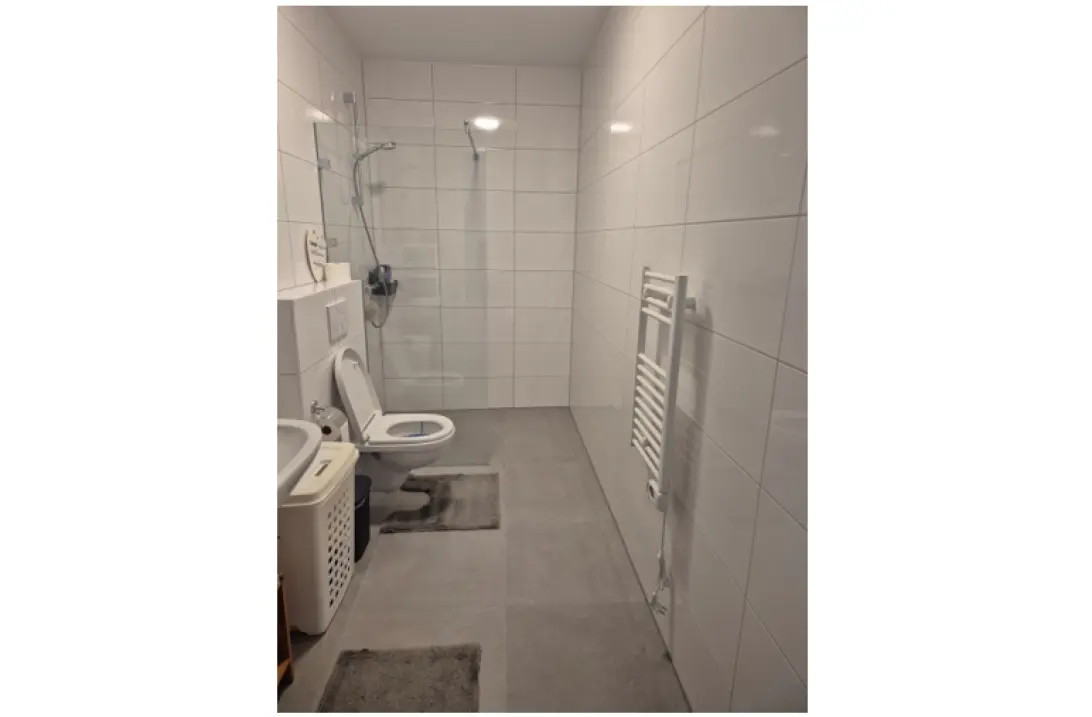 - Betegelde badkamer voorzien van hangend toilet, inloopdouche en wastafel;