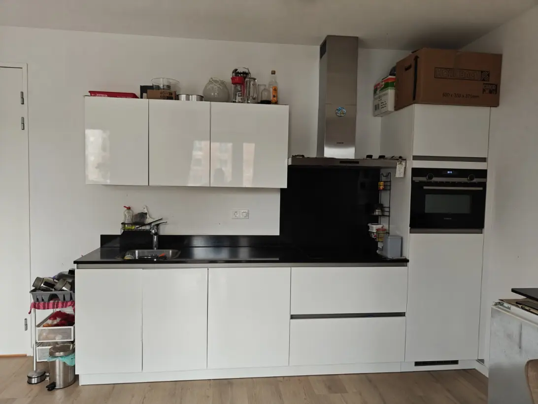 - Woonkamer met open keuken voorzien van diverse inbouwapparatuur waaronder koelkast, inductiekookplaat, combimagnetron, vaatwasser en recirculatieafzuigkap;